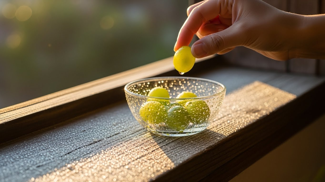 샤인머스켓은 껍질이 얇아 그냥 먹기 좋죠. 껍질에는 식이섬유와 항산화 성분이 많아 당 흡수 속도를 늦춰주는 역할을 합니다. 껍질을 뱉지 말고 꼭꼭 씹어 천천히 드세요. 뇌가 "아, 이제 달콤한 게 들어왔구나"라고 인지할 시간을 주어야 폭식을 막을 수 있습니다.